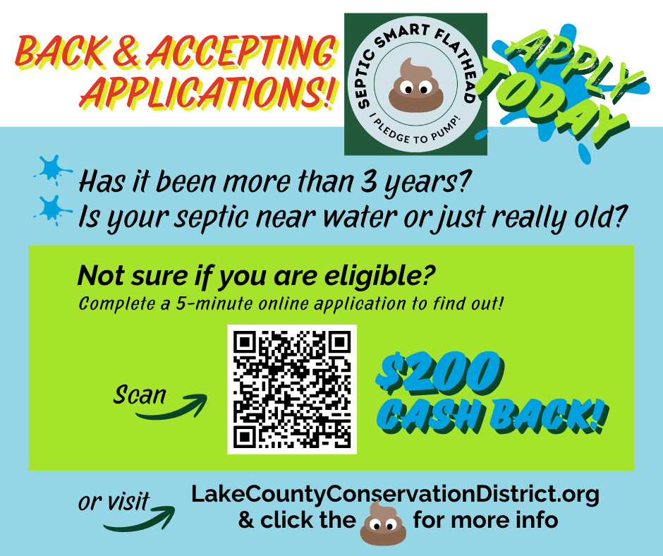 The Flathead Lakers is proud to partner with the Lake Country Conservation District in our efforts to reduce nonpoint source polution from underperforming septic systems in the Flathead Basin. If you live in Lake or Flathead Countys, and own a septic system that is over 20 years old or within 500 feet of surface waters, you may qualify for a $200 cost share reimbursement for system maintenance (pumping and inspection). LCCD is currently accepting applications for this program. Applications must be pre-approved prior to pumpout. Visit LCCD for more information on the septic pumping cost share program.