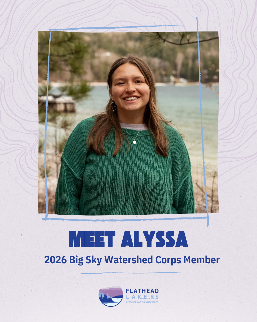 Alyssa is a recent college graduate from Colorado State University with degrees in Ecosystem Science & Sustainability and Spanish. She is from Austin, Texas and has a passion for ecotourism and environmental communication. Alyssa loves to travel and studied abroad in both Panama and Spain during college. Her love for going new places is what brought her to Montana, and she hopes to explore the Flathead Watershed area as much as possible while she is serving her term here.